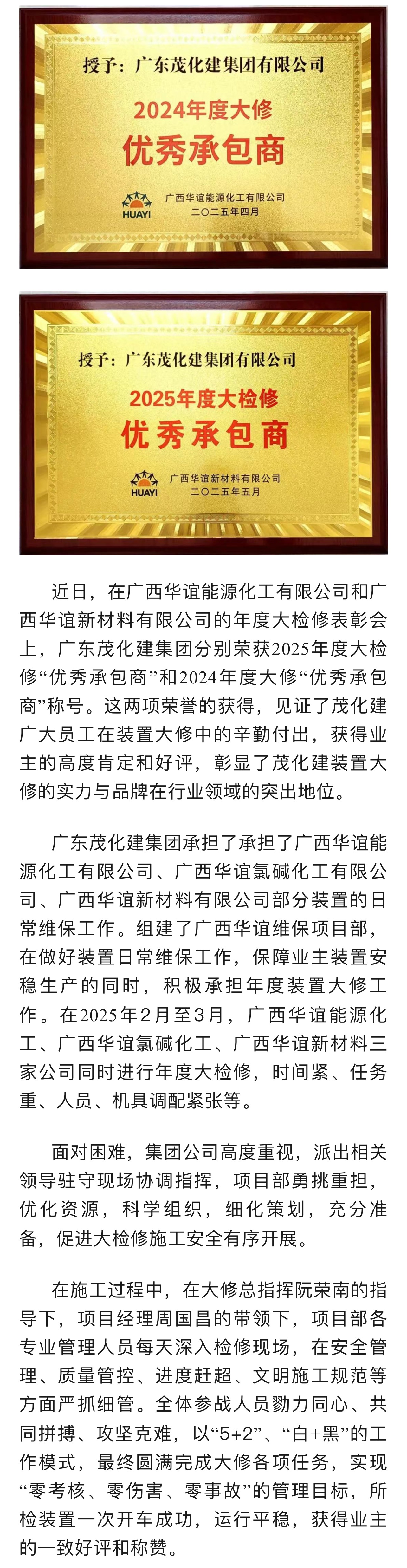雙喜臨門|茂化建榮獲廣西華誼能源化工、新材料大修優(yōu)秀承包商稱號(hào)