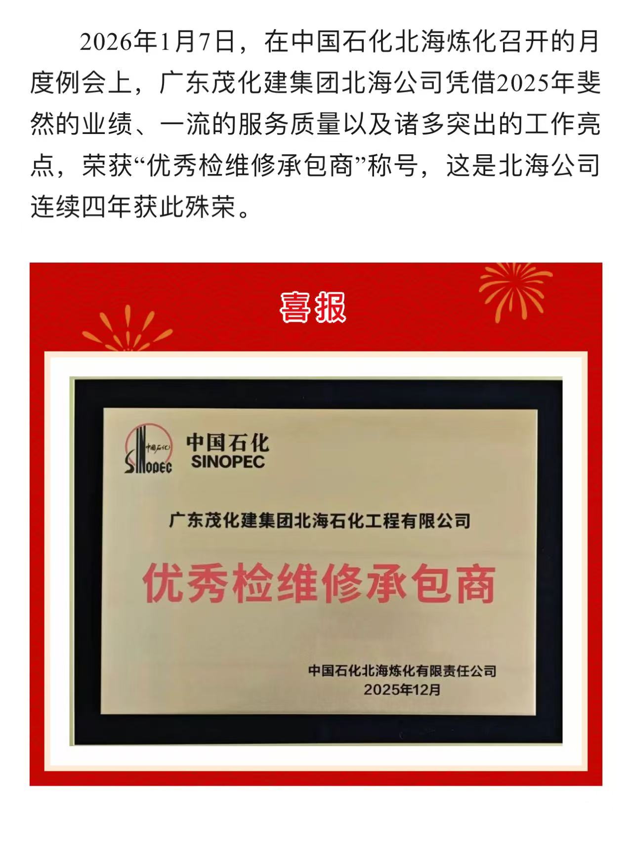 喜報 | 廣東茂化建集團(tuán)北海公司榮獲2025年度“優(yōu)秀檢維修承包商”稱號