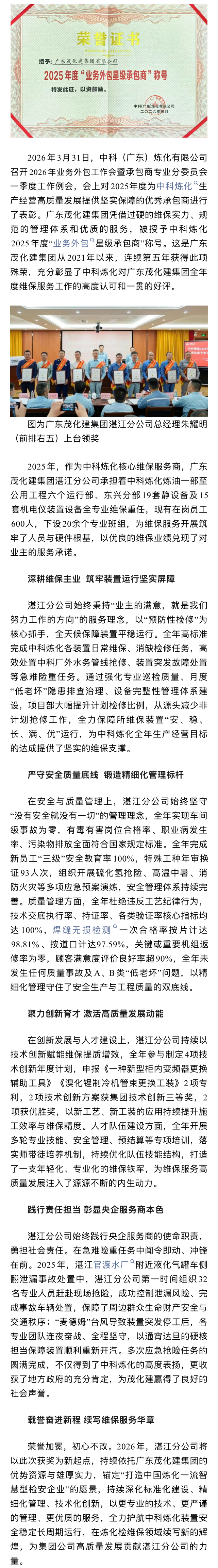 喜報(bào)|榮獲中科煉化2025年度“ 業(yè)務(wù)外包星級(jí)承包商”稱(chēng)號(hào)
